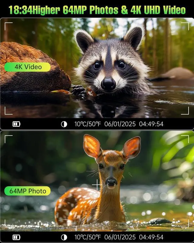 Hunting Trail Camera: trail camera delivers 64MP photo resolution. Additionally, it records high-resolution UHD 4K video with audio, ensuring it captures wildlife moments in a more detailed, and vivid manner.