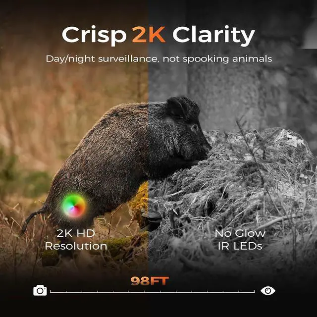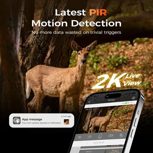 2K HD Live Streaming & Infrared Night VisionImmerse yourself in the wild with stunning 2K HD video quality, capturing every tiny detail with exceptional precision. Powered by advanced low-light infrared technology, this game camera offers an impressive 85-foot night vision range. It activates silently at dusk to capture crisp HD nighttime images, ensuring zero disturbance to the wildlife around