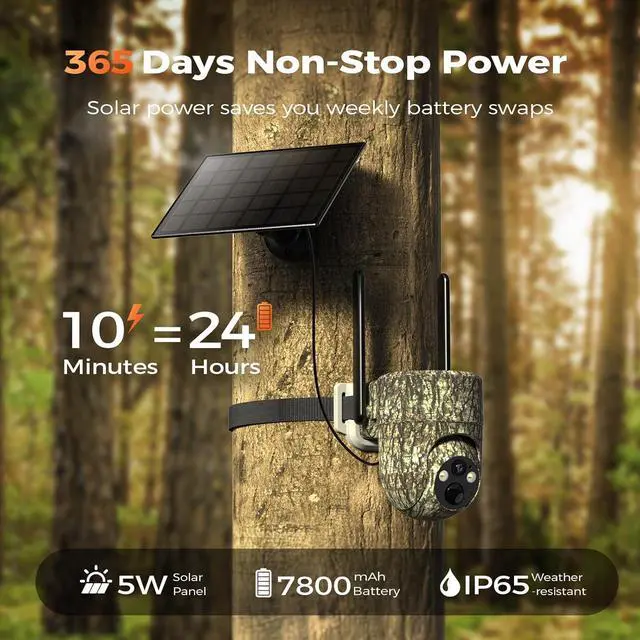 Solar-Powered & IP65 WeatherproofThis solar cellular game camera is fitted with a high-efficiency 5W solar panel and a 7800mAh rechargeable battery, saving you the hassle of frequent recharging and ensuring non-stop power supply all year round. Even on cloudy days, the cellular trail camera maintains stable monitoring, making it a top choice for outdoor enthusiasts. Boasting an IP65 waterproof rating, it operates reliably in extreme temperatures (-20°C to 50°C), guaranteeing steady performance in areas without Wi-Fi or electricitysuch as rainforests and farms