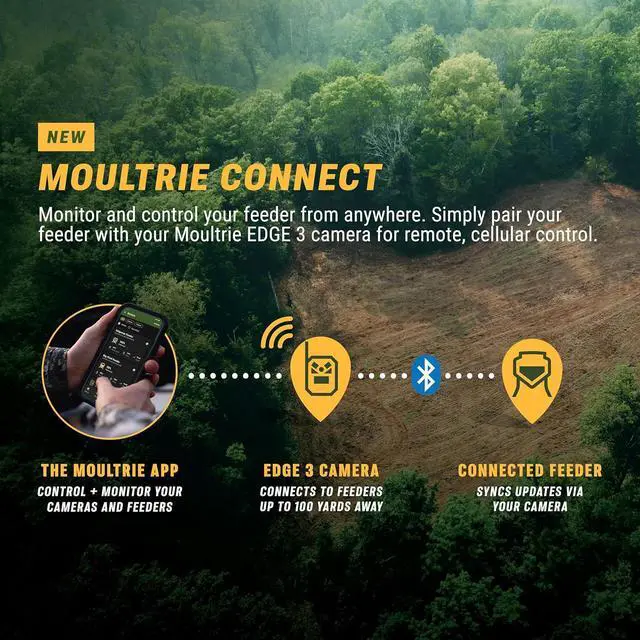 Remote Feeder Control via Moultrie Connect Control and monitor your Moultrie cameras and feeders from one app. EDGE 3 syncs with compatible feeders in the field so you can adjust feed schedules, check feed levels, and monitor activity at your feeder