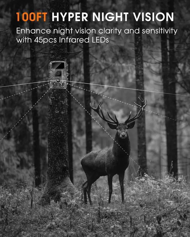 130-degree wide-angle night visionPunvoe game camera provides adaptive lighting to prevent over- or underexposure of night vision. This WiFi tracking camera allows you to experience excellent night vision with a wide angle of up to 130 degrees, which is perfect for capturing wildlife behavior without interference.