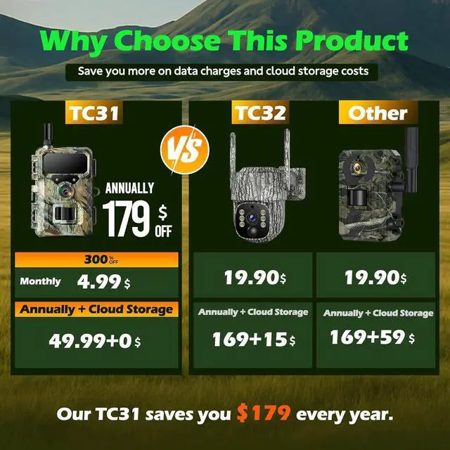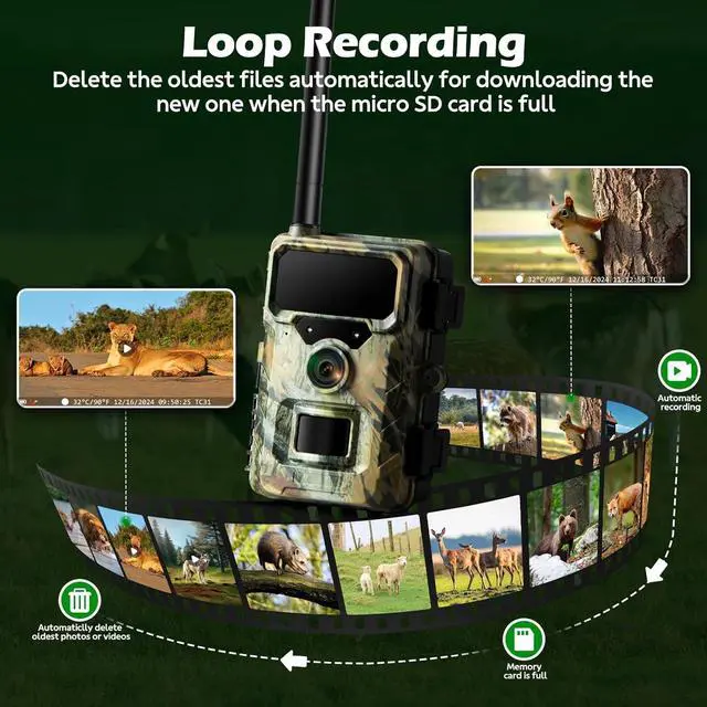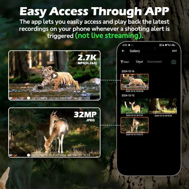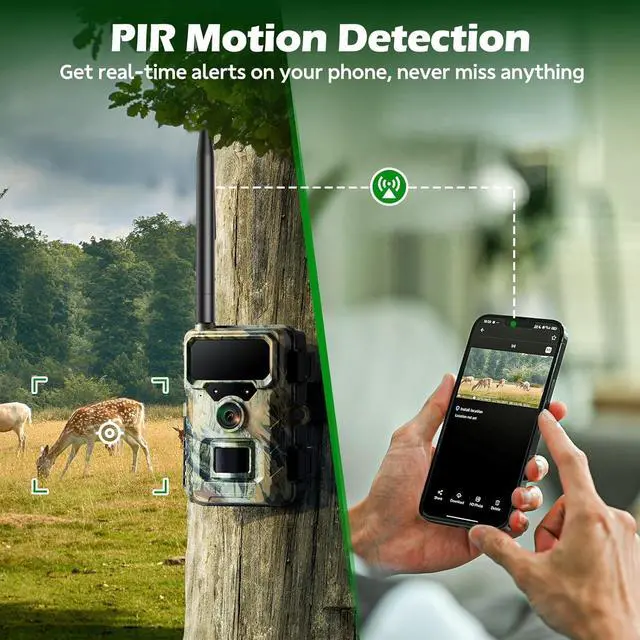 32MP Photos & 1080P Videos with Real-Time AlertsCapture stunning detail with crystal-clear 32MP images and 1080P videos from your trail cam. Get instant motion alerts on your smartphone when new footage is uploaded to the cloud, ensuring you never miss important activity.