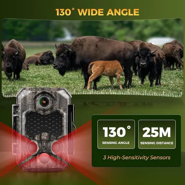 Swift Detection and Extended Coverage: Our wildlife camera delivers lightning-fast 0.1 s trigger speed to capture wildlife in crisp detail the instant motion is detected. With 25-meter long-range detection and a wide 130° sensing angle, it monitors a broad area with precision, ensuring no movement goes unnoticed.