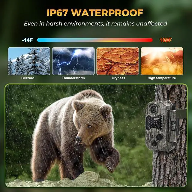 IP67 Waterproof & Dustproof: With IP67-rated protection, our trail camera is sealed against heavy rain, snow, dust, and extreme temperatures (-20°C to 60°C). Perfect for rugged outdoor usewhether in muddy swamps, dusty trails, or freezing woods, it delivers uninterrupted performance season after season.