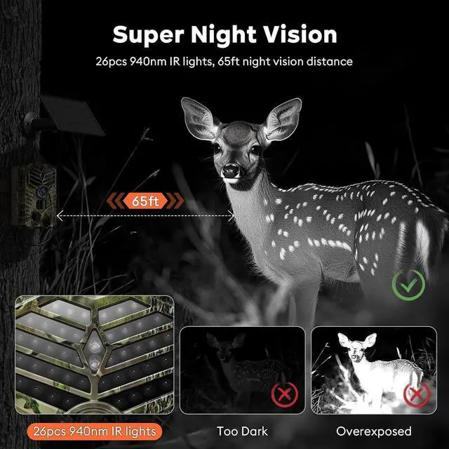 High-resolution photos and videos: Equipped with a 4-megapixel lens and 2.0" LCD screen, it captures 64MP still images and 4K videos of the vivid world of wildlife. This game camera uses enhanced 940nm no-glow infrared technology and adaptive fill light to easily capture detail-rich images and videos at night while minimizing disturbance to animals.