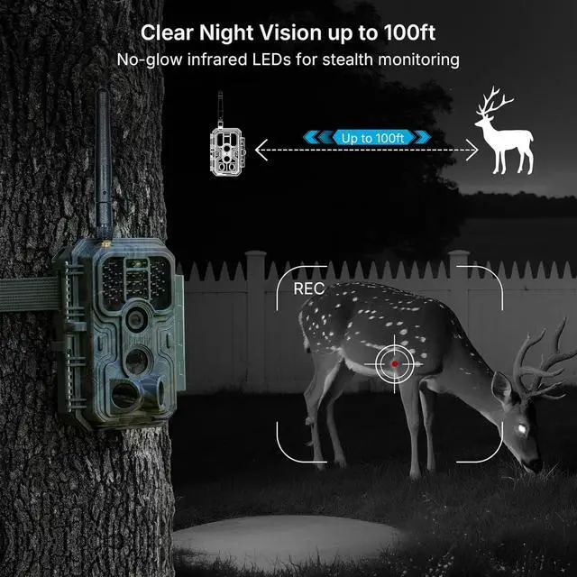No Glow Night Vision up to 100ft - Invisible infrared LEDs ensure discreet night monitoring without startling wildlife. Enjoy clear nighttime images at up to 100ft range.