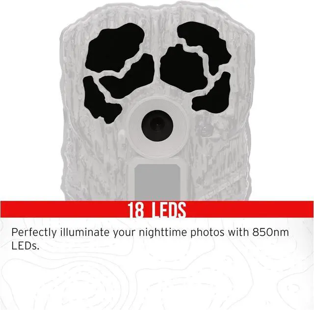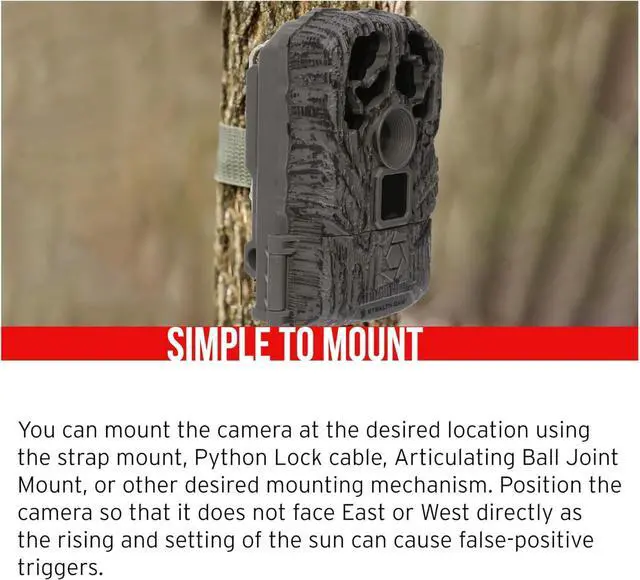features a 60 feet infrared detection range and burst mode to capture detailed information about your target area. This trail camera features 16 Megapixels and 480 Video at 30FPS. This trail camera in burst mode can take 1 to 3 images per triggering and has 120/60/30/15/5 second recovery time. The trigger speed of this camera is 0.7 seconds with Time/Date/Moon Phase. It comes with an Integrated Python lock latch to fix it on a tree and operates on 8 AA batteries (not included).