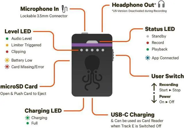 a traveling journalist: Whatever your project, record it professionally and easily with the Tentacle Sync Track E Pocket Audio Recorder with Timecode. Easy Integration into your WorkflowThe Tentacle Setup App which remotely controls everything except the weather helps you enjoy seamless integration into your current workflow. Setup and control all your Track E and Sync E devices via Bluetooth on your mobile device. One screen. All the information you need. Everything you Need to Get StartedUnbox your Track E and you can be ready to go in just three minutes.