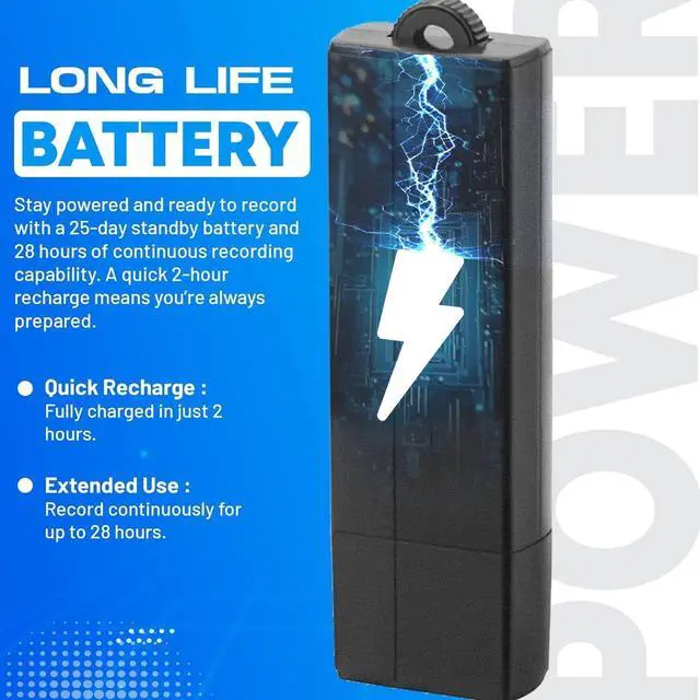 Quick Recharge Time Recharge fully in just 2 hours and enjoy up to 24 hours of continuous audio capture on a single charge.