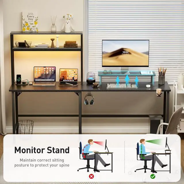 Generous Storage SpaceWith its two storage shelves, the computer desk with storage provides ample space to easily organize your gaming equipment and office accessories, keeping your desktop clean and tidy; The removable monitor stand is designed based on ergonomic principles; We've also added a cup holder and a headphone hook to improve convenience and organization on the desk, allowing gamers to better organize their accessories and focus fully on their gaming experience