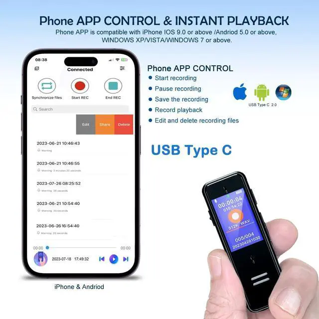 64GB Memory Voice RecorderThe storage capacity of the recorder is 64GB. Securely store 1600 hours of recordings/MP3 song files using the built-in EMMC memory card.