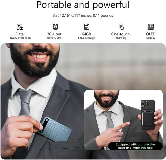 Tiny and Easy to Use: The ai note taking device comes with text conversion function, compact and lightweight ( 2.16 * 3.35 * 0.117 inches, 0.11 pounds), and the magnetic case design allows it to be firmly attached to the phone during calls, making it easy to carry. One click start recording, pause/resume recording at any time. The AI DVR Link APP interface is intuitive and easy to use, allowing users to quickly get started