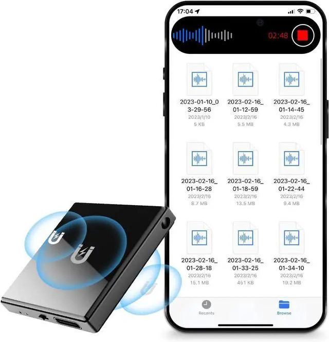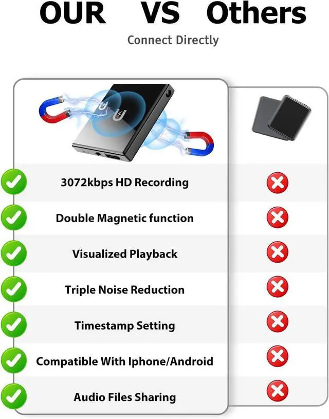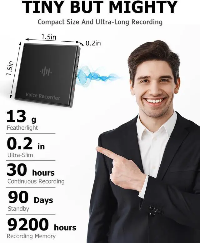 Compact and Portable Dual-Sided Magnetic Recorder: This recorder features an ultra-thin body ( 0.20 inches) and weighs just 13 grams, easily fitting into your pocket, wallet, or pencil case. Its dual-sided magnetic design allows you to conveniently attach it to desks, car seats, or other metal surfaces during interviews or meetings.