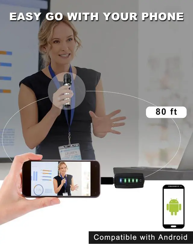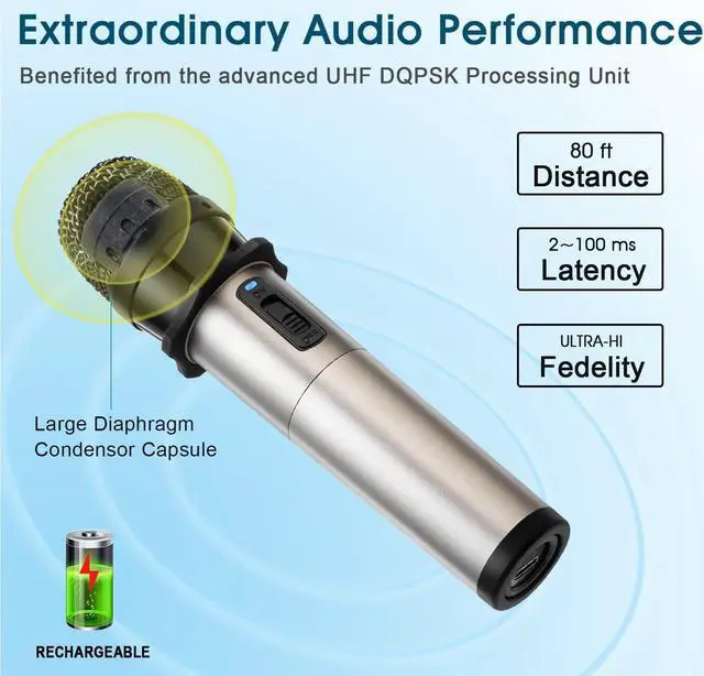EASY SETUP & OPERATE - Plug & Play, cable-free, the wireless mic system is preset with 20 selectable frequencies. (902-928Mhz complies with FCC rules) Automatic frequency pairing makes it portable, versatile and easy to setup, less prone to interference and low distortion, thus to use its best performance.