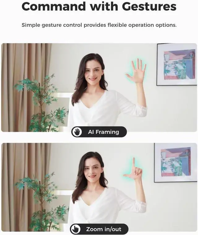 DYNAMIC GESTURE CONTROL 2.0 Say goodbye to tedious manual operations with Dynamic Gesture Control 2.0. Face our PTZ webcam and make a gesture to lock onto a tracking target or a gesture to easily control the zoom. The default gesture zoom is 2x, and the zoom range can be modified through the OBSBOT software.