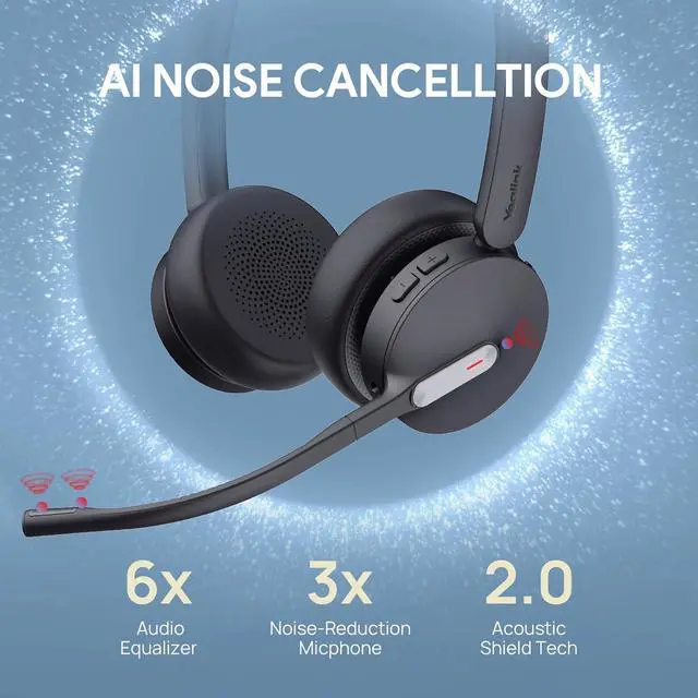 AI Noise Cancelling Headset: 3x noise reduction mic, 6x audio equalizers, equipped with Acoustic Shield Tech 2.0, maintain clear calls. Multi-device plug & play, office headset for desk phone, computer (USB link) and mobile phone (BT)