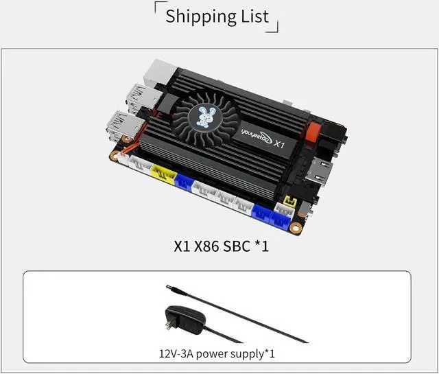 [Packing list] In the box: youyeetoo X1 x86 single board computer*1(RAM/Strorage depend on your order), 12V DC / 3A power supply *1, heat sink *1. If you have Any custimzation requirements or technical support please contact us by wpd#youeetoo. com (#------>@) or post your quesiton on forum#youyeetoo&com/(#------>@, &. )