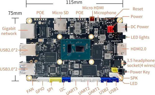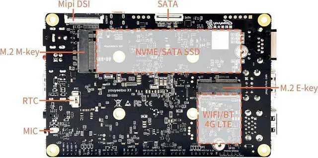 [Expandible Onboard Interfaces] youyeetoo X1 SBC supports Dual 4K and 3-way video output, including full-size HDMI, Micro HDMI, Display interface over MIPI, PCIe 3.0 M. 2 2280 M-key socket for NVMe or SATA SSD, 4-pin I2C header, 5-pin SPI header, 6-pin header with 5x GPIOs;
