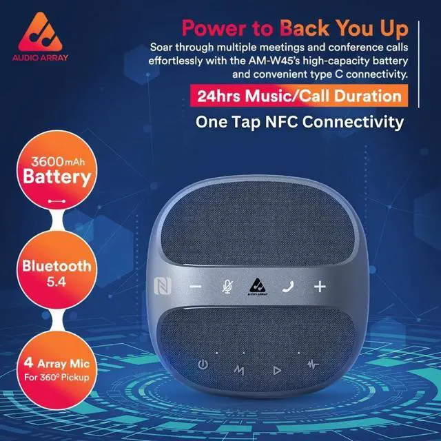 Long Battery Life At 50% volume, the AM-W45 speakerphone allows up to 24 hours of use, and at max volume, it can be used for 8 hours. Built-in 3600mAh large capacity electric battery equipped with a USB-C Cable for Charging.