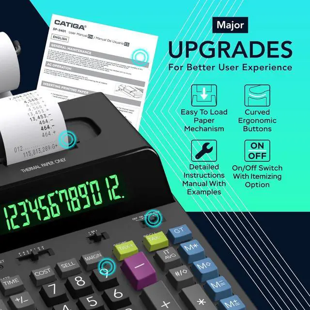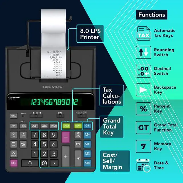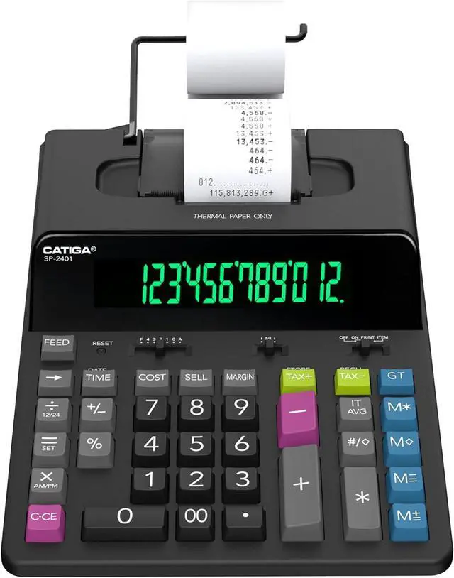 CATIGA 12 Digit Thermal Printing Calculator with Tape Print Out, Ink-Free Adding Machine, 5X Faster Quite at 8.0 LPS, Extra Large Fluorescent Display, Tax Calculation with Clock and Calendar, SP-2401