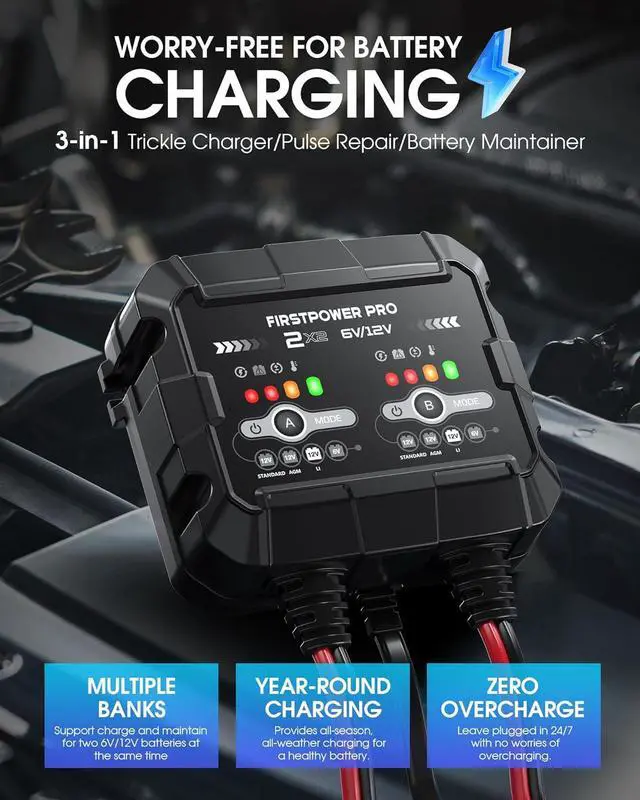 Battery Restoration & Maintenance1) An advanced battery repair mode, helps to restore the old/idle batteries lost performance and extend battery life. 2) Beyond maintenance - not just a battery trickle charger, but also an advanced battery maintainer. Its a fully-automatic, worry-free smart battery charger for everyday use - 24/7 - with zero overcharge.