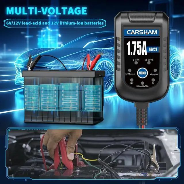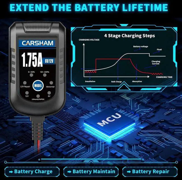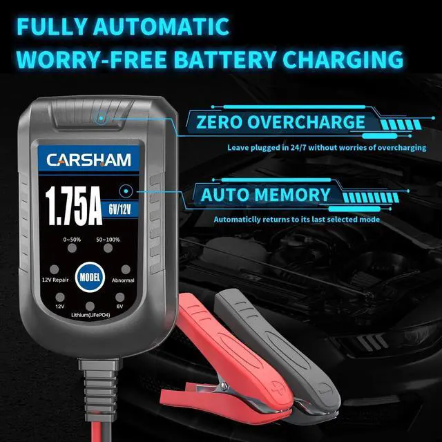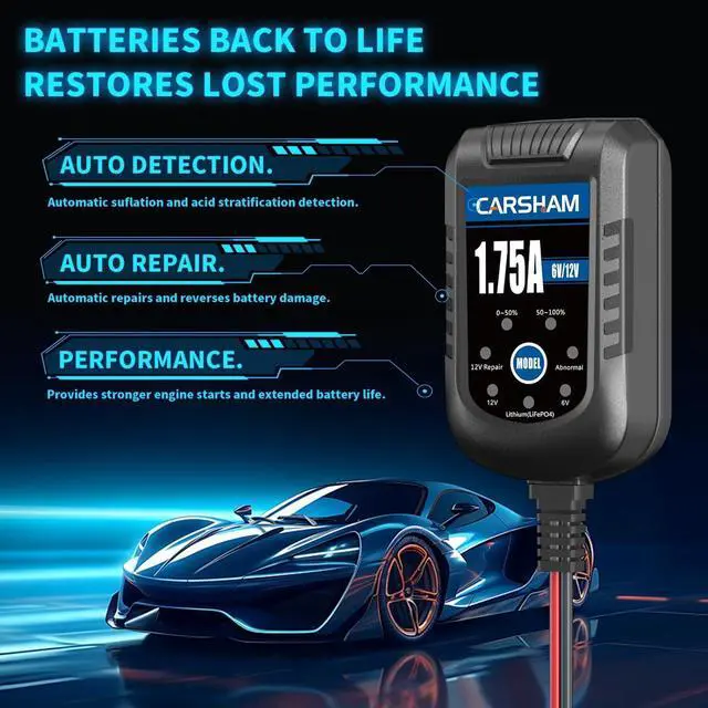 Trickle Charger & Maintainer & Pulse repair6/12 volt automotive battery maintainer charger provide visual state-of-charge feedback and diagnostic information, even when in maintenance mode. Apply slow pulse reconditioner technology to detect battery sulfation and acid stratification to restore lost battery performance, strengthen engine starts and extend battery life.