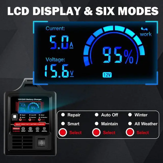 Winter Mode and All Weather: The 12 volt battery charger automatically regulates charging power (current/voltage) based on real-time battery temperature data. Starts with a reduced charging rate in extreme cold, then gradually increases power as the battery warms up for a balance of speed and safety.