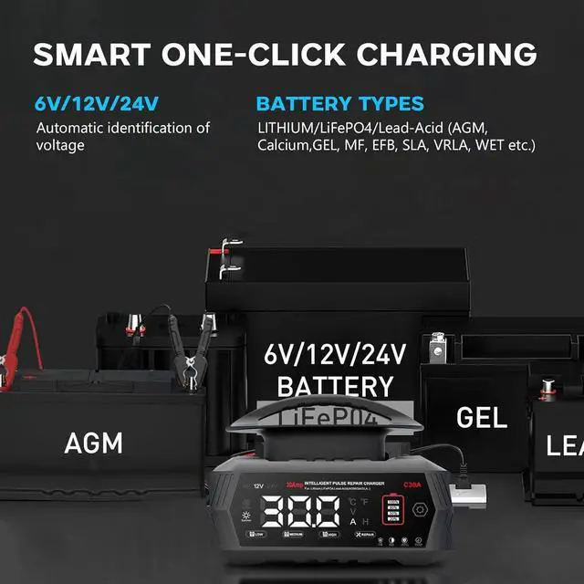 Car Battery]: Car battery charging units uses 9-stage automatic charging, including battery detection, desulfurization, trickle charging, etc. to achieve the best and most efficient charging. Repair mode is used to repair and activate old and weak batteries.