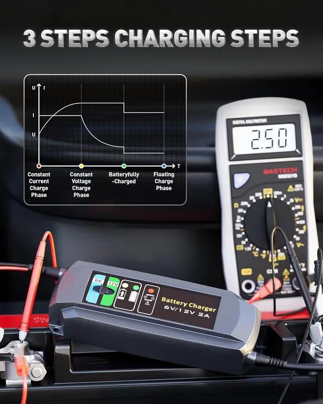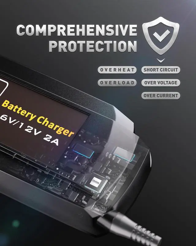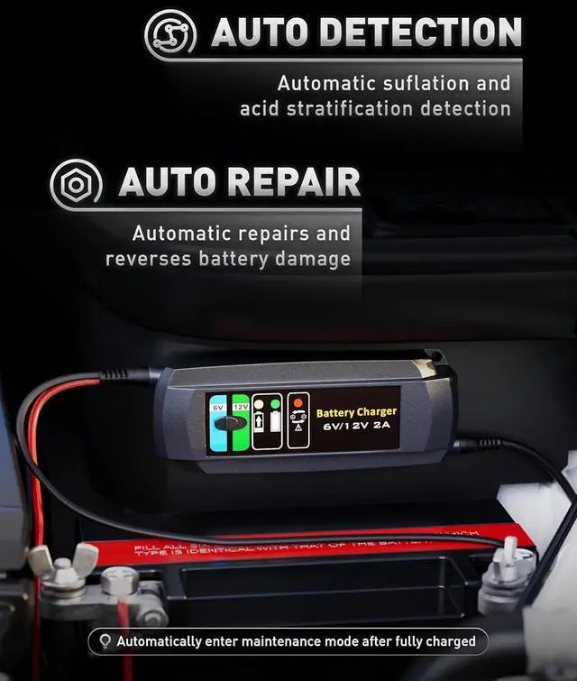 Anti-Depletion & Battery Rescue FeatureErayak 2A car battery charger is designed to save your battery by rescuing deeply discharged ones with voltage as low as 2.5V, safely bringing them back to life. With its intelligent anti-depletion functionality, the charger automatically detects the batterys charge level and starts charging when the voltage drops too low. It adjusts the output to prevent over-discharge, ensuring the battery remains in optimal condition and prolonging its lifespan.