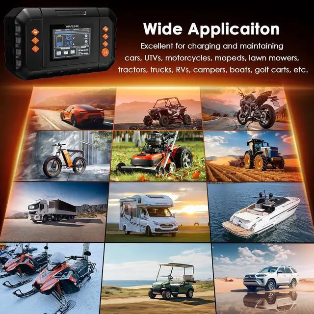 All-in-One Battery ChargerThis intelligent multi-function battery charger is designed to be compatible with a variety of lead-acid batteries(6V/12V/24V), lithium batteries(12V/24V), and LiFePO4 batteries(12V/24V). Whether you have traditional liquid batteries or modern lithium-ion batteries, this charger can provide optimal charging solutions. Ideal for charging and maintaining a range of vehicles such as AGM, GEL, SLA, cars, motorcycles, tractors, boats, golf carts, and more.