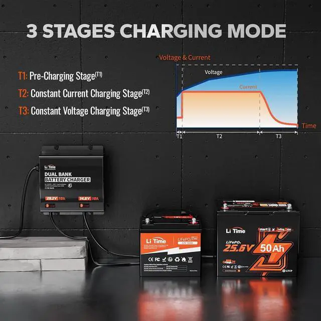Safety Protection & Activate Battery: LiTime LiFePO4 charger with CE, FCC& RoHS Certifications, full automatic transition of CC, CV and Float/Cut off. With 5 safety protection, this charger ensures the safety of internal components and extends its lifespan. These mechanisms include protection against over temperature, over-current protection, reverse polarity connection, output short-circuit, and output over-Voltage. Also, the battery charger supports activating the lithium battery that was protected by BMS.