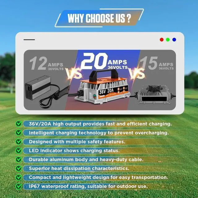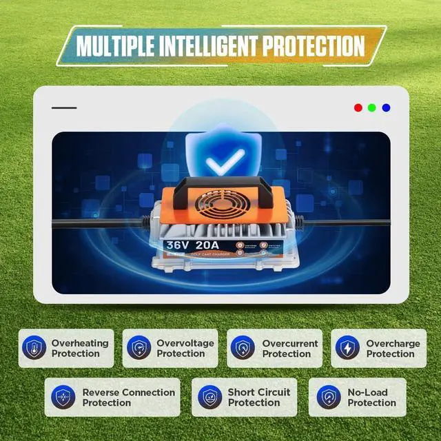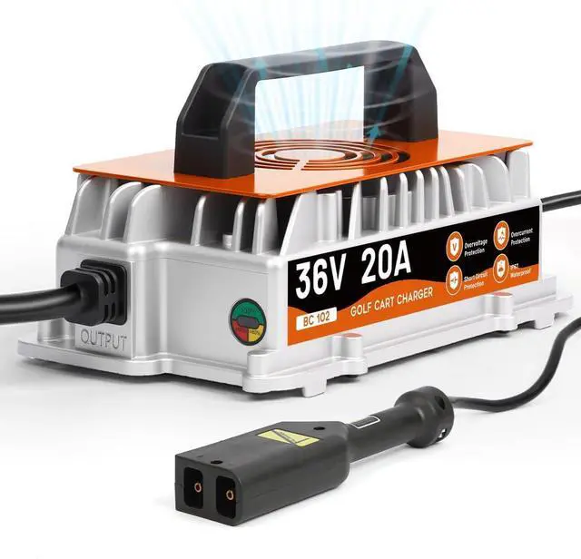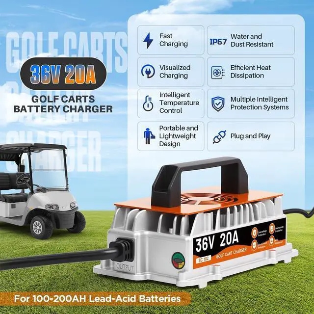 7 Safety Functions & IP67 Waterproof36 volt golf cart battery charger is designed with safety in mind, it is designed with overcharge/overheat/overcurrent/overvoltage/reverse connection/short circuit/no load protection, so you can use it with confidence. 36v golf cart charger is fully potted inside to provide IP67 weatherproof rating, you don't have to worry that the charger will be damaged due to water, dust, or vibration, it's perfect for outdoor use.