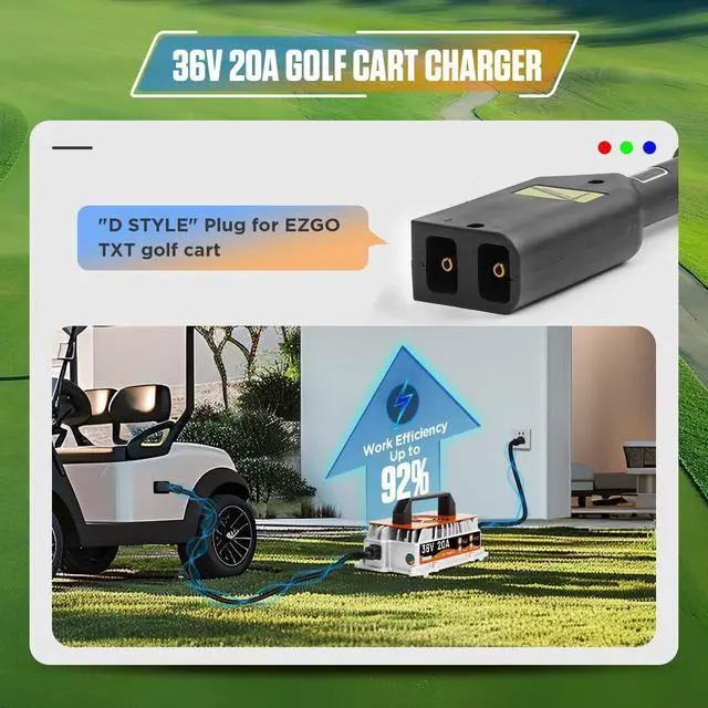 The golf cart battery charger is specially designed for 36 volt EZGO and TXT golf carts, it can provide 36V 20A 1250W high output, with high output voltage/current accuracy and good stability, suitable for flooded lead-acid batteries.