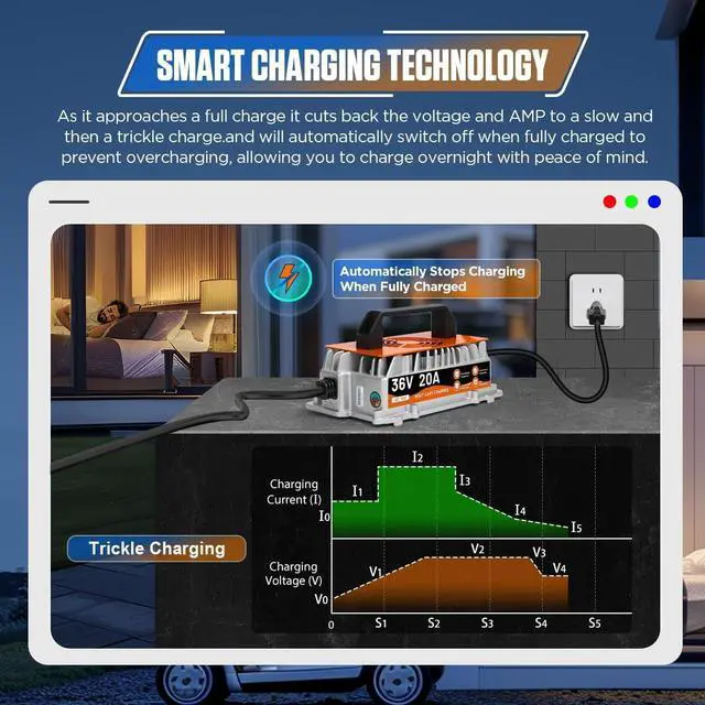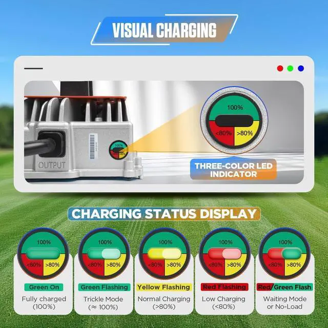 Visual Charging & Charging Time ControlEZGO 36v charger is designed with a three-color indicator light to display the charging status.