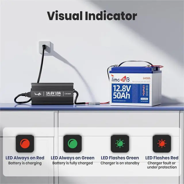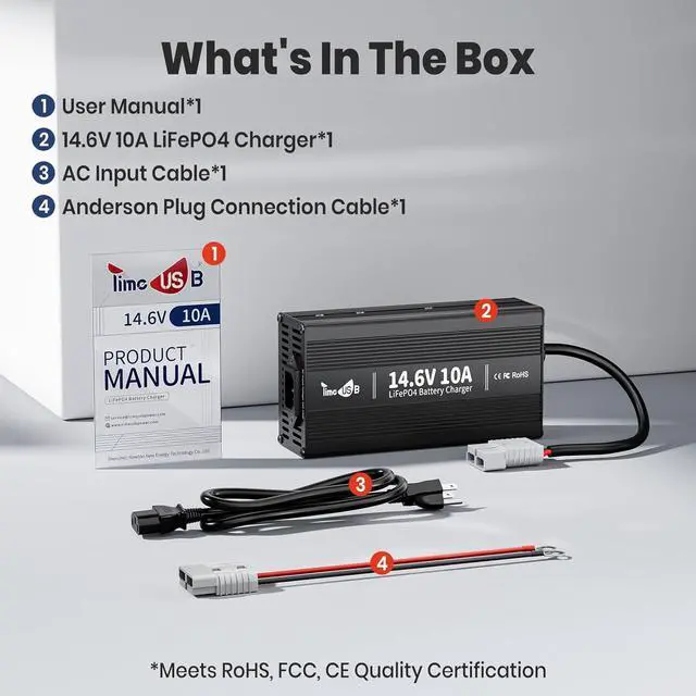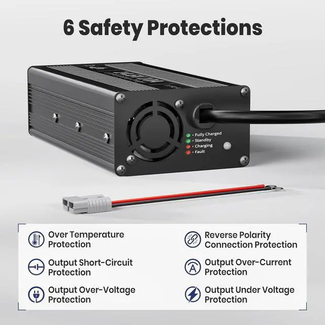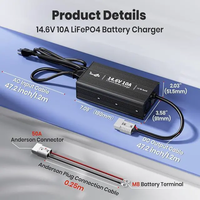 COMPREHENSIVE SAFETY PROTECTIONS Constructed with an aluminum alloy housing for enhanced durability and heat dissipation. Features an integrated cooling fan, M8 terminals, and includes a 50A Anderson connector for versatile connectivity.
