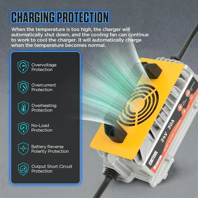 Six Safe Charging Protections: Built-in circuit safeguards provide overvoltage & overcurrent protection. No output without battery connection, reverse-connection/short-circuit cuts off internal circuits to avoid damage, auto-shuts down at high temps and resumes charging when cooled