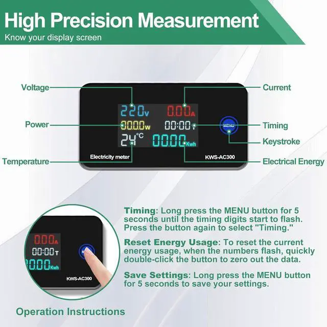 Data Storage and Recovery: Even during power outages, the monitor continues to preserve historical energy consumption data, facilitating tracking of device usage and analysis of consumption trends. A long press on the button on the right side of the screen allows for easy reset of the data, making it convenient for monitoring other devices or experiments.