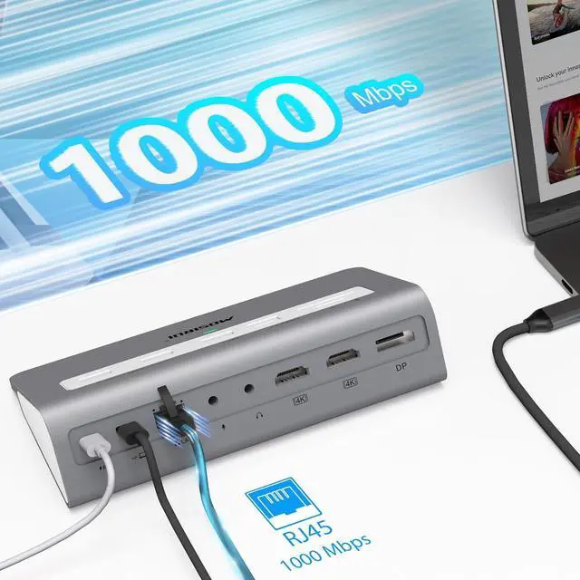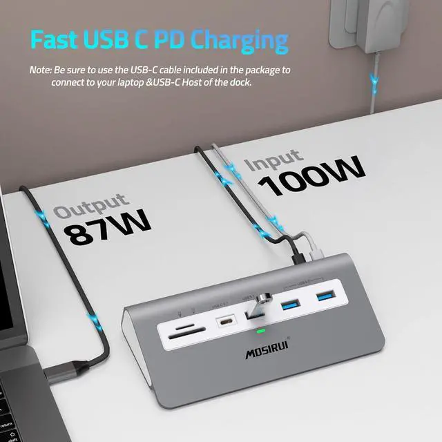 100W POWER DELIVERY PORT & GIGABIT ETHERNET: Dual Monitor Docking Station Maximum 100W output with the docking station' usb-c power deliver port, offers significantly faster charging time. Also, this usb c Docking station supports 10/100/1000BASE-T Lan networks, just plug in an ethernet cable, you can enjoy the ultra-fast gigabyte ethernet speed and the reliability of a wired connection directly. Worry-free about WIFI's instability and interference from USB 3.0;