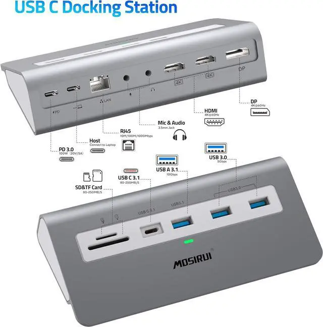 FAST SPEED USB C DOCK: USB c hub streamline USB C/A 3.1 & 2xUSB A 3.0 port not only allows you quick transfer of data with a speed up to 10Gbps, but also supports to connect to peripheral devices such as mouse keyboards. USB C to SD/TF card reader (speed up to 104Mbs) allows you to easily browse and copy photos and videos from your cameras, and quickly share your beautiful moments.