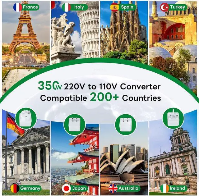 7-in-1 Power Converter for Europe The power converter adapter combo includes 3*AC outlets, 2*USB-A ports and 2*USB-C ports, can charge up to 6 devices at a time, enabling you to charge your Bluetooth headphones, phone, tablet, etc. Measuring 6.5 x 3.3 x 1.38 inches, the portable voltage converter making it perfect for both short and long trips