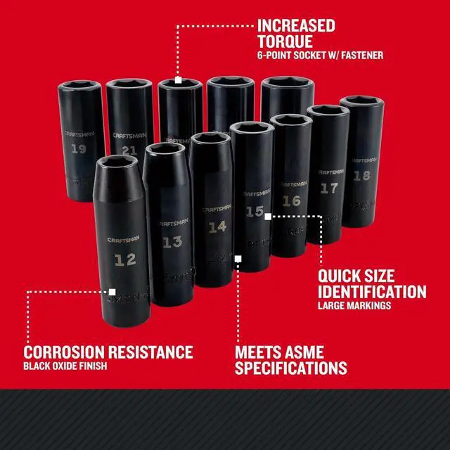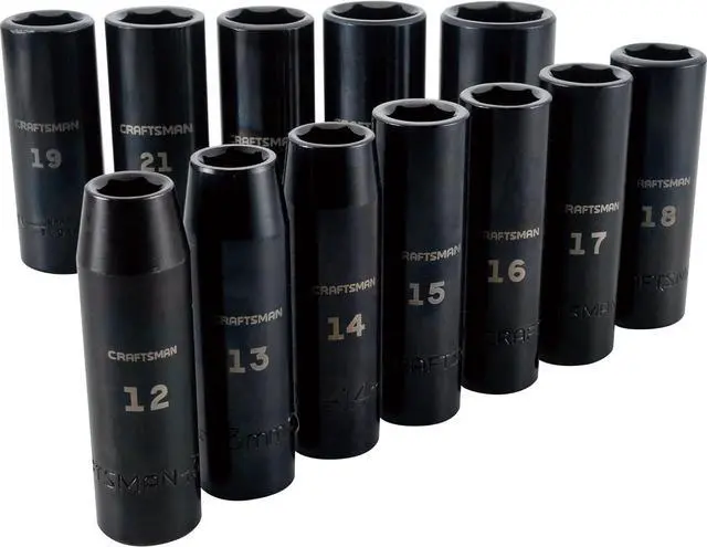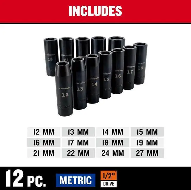 12-piece Metric Deep Impact Socket Set is engineered and constructed to endure high torque application with impact wrenches and impact sockets 1/2 drive. These impact metric sockets are specially designed to engage with the flats of fasteners to prevent rounding so it's time to turn up the torque and turn tough jobs into easy ones.