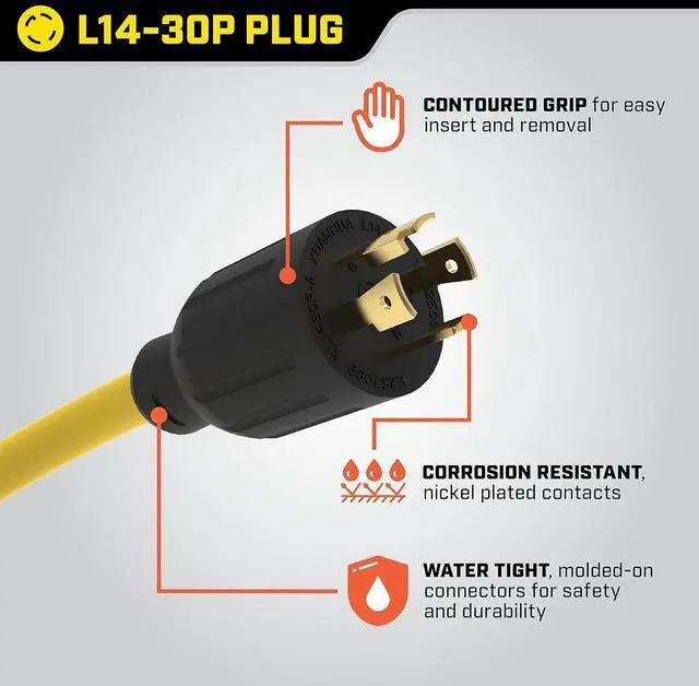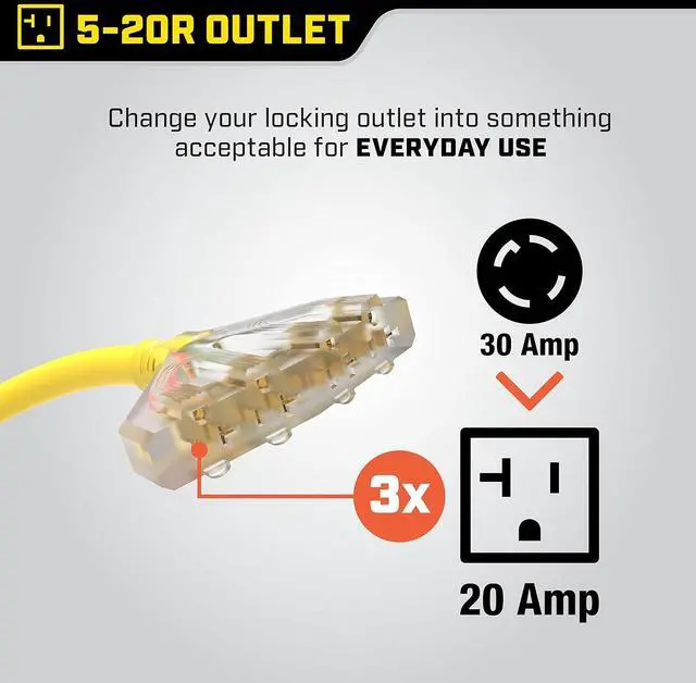 The Champion Power Equipment 48036 25-Foot 30-Amp 125/250-Volt Generator Extension Cord changes your L14-30R locking outlet to four 5-20R household outlets. Whether youre powering your essential items during an emergency or powering up your tools in remote locations, Champions 25-foot extension cord can be depended upon in any situation. Designed in a fan-style configuration, this cord includes dust covers to keep your outlets clean and protected when not in use. Ideal for quick and dependable use of power, this 25-foot, high-capacity 10-gauge wire is surrounded by durable, outdoor-rated insulation (SJTW). Featuring a heat and cold resistant thermoplastic jacket, you can be sure your power cord will remain flexible and function perfectly whether the temperature outside is extremely hot or extremely cold.