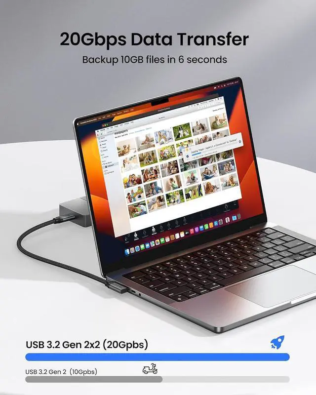 USB C 3.2 20Gbps Data Transfer This usb c data cable elbow is USB 3.2 Gen 2 compliant and can quickly send or receive HD movies, audio and 4K video signals, backing up 10GB files in less than 10s. Support connecting USB C port hub, docking station, SSD and other USB C port devices, plug and play, rest assured and reliable.