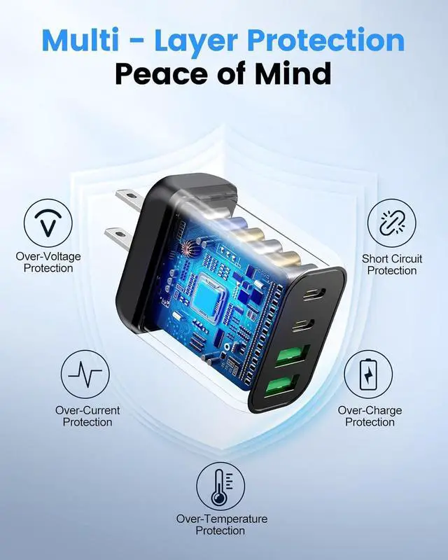 Multiple Safety ProtectionThe type c charger is built with an advanced safety system that includes Over-Voltage Protection, Over-Current Protection, Over-Temperature Protection, Over-Charge Protection, and Short Circuit Protection. Whether you're charging a phone, tablet, or any USB-powered device, this usb c charger block ensures stable, secure, and worry-free performance for all your charging needs.