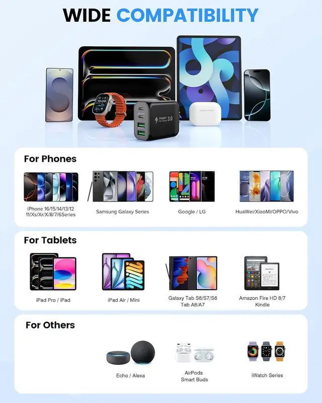 Universal CompatibilityThis type c charging block supports fast charging for a wide range of devices. Compatible with iPhone 17/16/15/14/13/12/11 series, iPhone XS/XR/X/SE, iPad Pro/Air/Mini, Galaxy S24/S23/S22/S21/S20/S10/S9/S8, Note 20/10, Google Pixel, LG, Kindle, tablets, and more. Its an excellent usbc charger and phone charger that meets all your everyday charging needs.