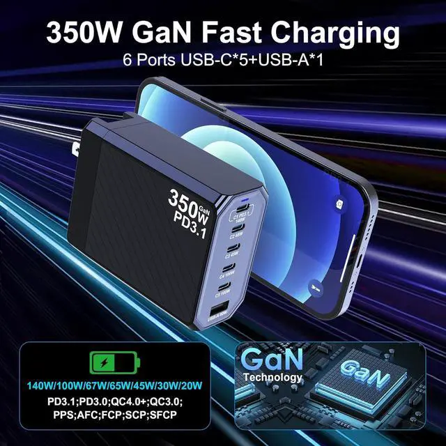 Advanced GaN Technology: The 350W usb c charger utilizes GaN technology for higher charging efficiency and lower heat loss, which ensures charging speed while reducing the charger's heat generation and prolonging its service life, and built-in multi-protection system and premium microchips, makes our chargers smaller and safer