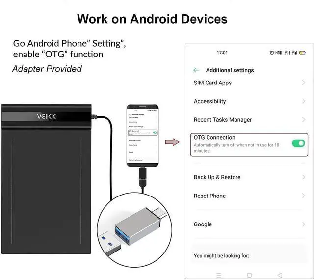 Android Phones: Its simple to connect with the included usbc adapter and worked immediately, without the need to additional drivers. You need to use the digital writing pad in vertical, but the drawing area will not change to half.