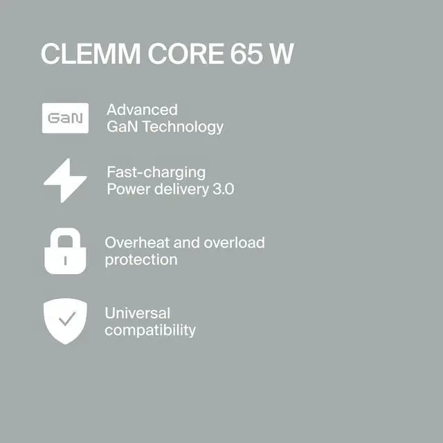 Portable & Convenient The pocket-sized Clemm Core 65 is compact and easy to carry. Perfect for travel, long commutes, or to keep in your pocket or purse. Replace bulky adapters with a fast-charging USB-A/USB-C charger.