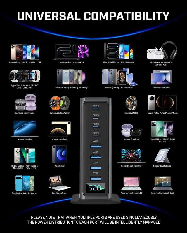 Universal CompatibilityThe USB-C & USB-A 8 ports charger block compatible with Tablet, Speaker, Headphone, Smart Watch, Game Consoles, Steam Deck/Airpods, Surface Pro 7/8, Macbook Pro 13''/15''/16"/Macbook 12''/13'', iPhone 16/15/14/13 Plus Pro Max, iPhone 12/11 Mini Pro Max, iPhone XS/ XS Max/XR/X/8 Plus/8/7 Plus/7/6 Plus, Galaxy S23, Ultra/S23/S22/S21/S21+/S21Ultra/Galaxy S10/S10+/S10e/S9/S9+/S8/S8+/Note 20/20 Ultra/10/9/8, iPad all Series and other USB-charged electronic devices.