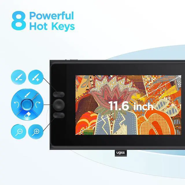 [8 Shortcut Keys ] The UE12 Graphics Tablet is equipped with 8 customizable shortcut keys boasting a concave-convex design, which facilitates blind operation. These convenient shortcut keys allow you to easily access commonly used drawing tools, such as pen, eraser, brush size adjustment, and undo function.